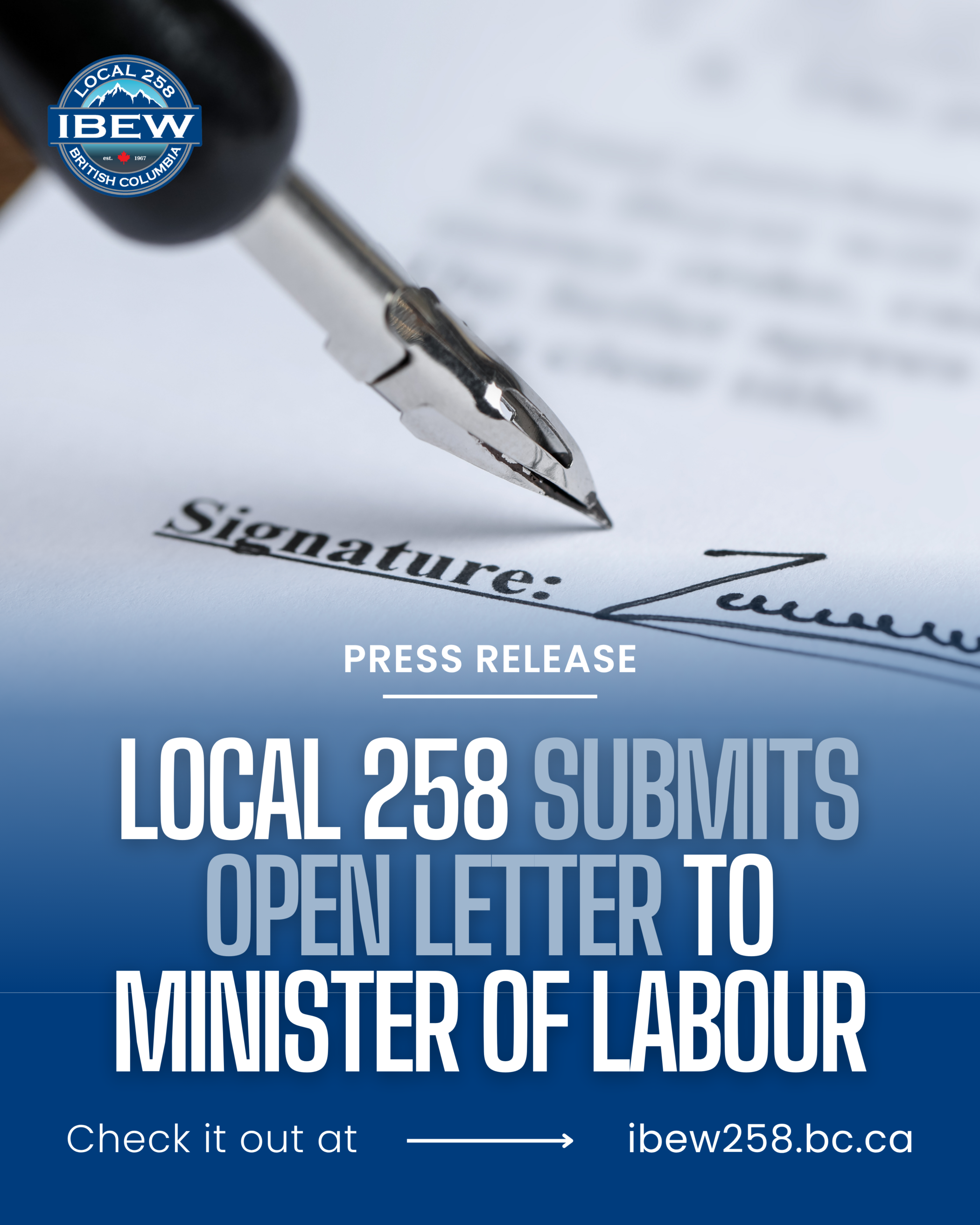 LANGLEY, B.C. — Local Union 258 of the International Brotherhood of Electrical Workers has submitted an open letter to the Honourable Jennifer Whiteside, Minister of Labour, calling for an immediate investigation into a BC Hydro contract awarded to a contractor who utilizes out-of-province labour.